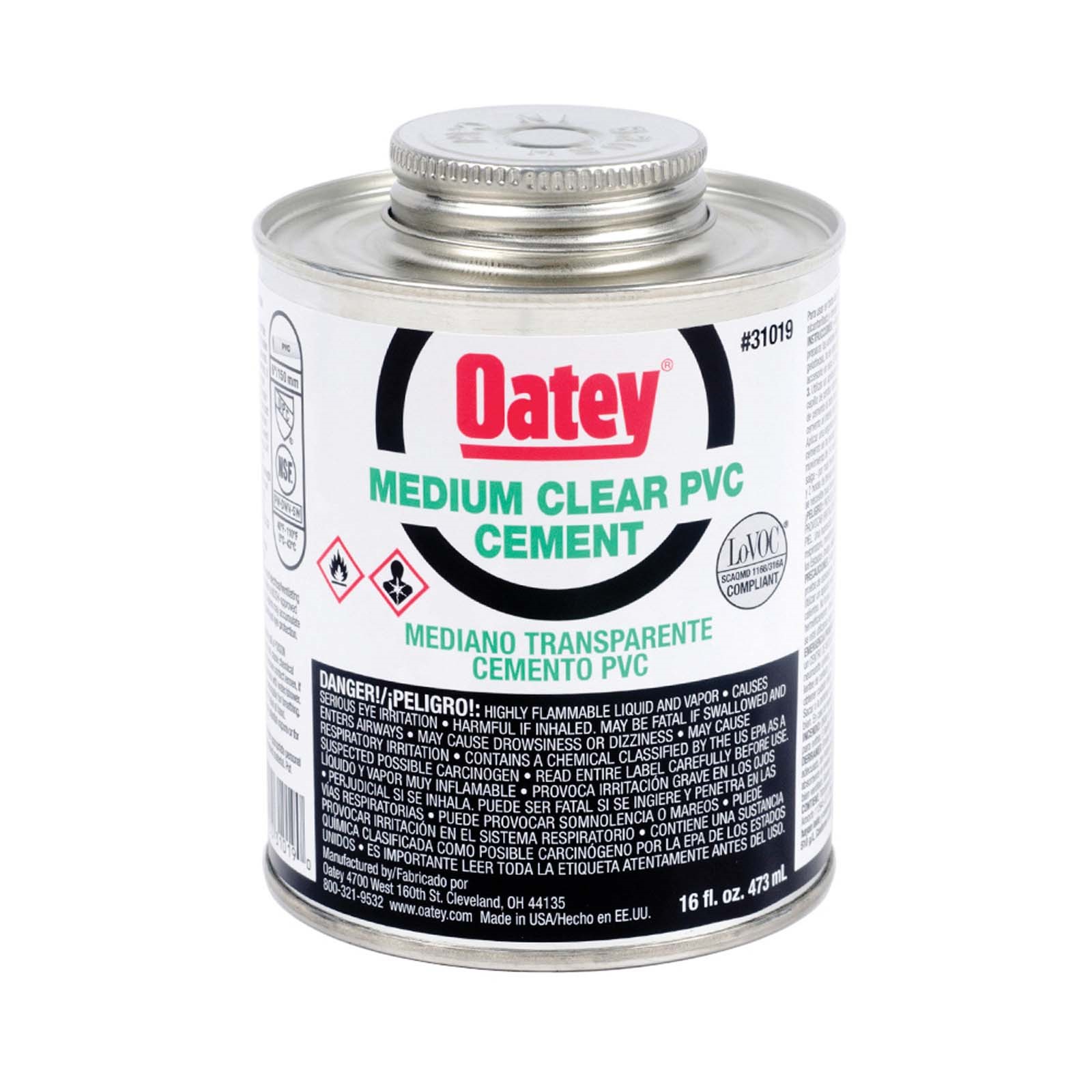 OATEY 31019 MEDIUM PVC CEMENT, 16 OZ CAN, CLEAR